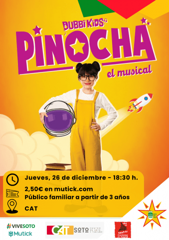 TIPO DE ACTIVIDAD: Red de Teatros de la CAM - Musical infantil; FECHA: Jueves 26 de Diciembre; HORA: 18:30 h; LUGAR: CAT; ENTRADAS: 2,5 € en mutick.com; Compañía La Ratonera Teatro Valentina encuentra un increíble tronco de madera donde esculpe un precioso títere al que llama Pinocha. Cuando Pinocha cobra vida, empieza a descubrir cosas […]