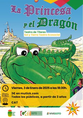 DÍA: 3 de enero; HORA: 18:30 horas; LUGAR: C.A.T.; PRECIO: 3€ en mutick.com; PÚBLICO: público a partir de 3 años; Sinopsis: El Dragón Artimañas amenaza con destruir el Reino de Tranquilia si no le entregan a la Princesa Valentina. Ella decide ir a "cantarle las cuarenta", pero su padre, el Rey Kalmodio, se lo impide. […]