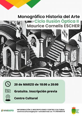 TÍTULO DEL EVENTO: Ciclo Ilusión Óptica II. Maurice Cornelis ESCHER. TIPO DE ACTIVIDAD: Monográfico Historia del Arte FECHAS: 20 de marzo HORA: 18:00 a 20:00h. LUGAR: Centro Cultural PRECIO: Gratuito Escher, la unión del arte y las matemáticas, el creador de los espacios imposibles y las composiciones infinitas, el artista ilusionista a través de la […]