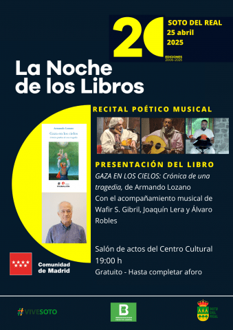 DÍA: 25 de abril; HORA: 19:00 a 20:00 h; LUGAR: Salón de Actos del Centro Cultural; ENTRADA: libre hasta completar aforo. Presentación del libro "Gaza en los cielos" de Armando Lozano, con el acompañamiento musical de Wafir S. Gibril, Joaquín Lera y Álvaro Robles.