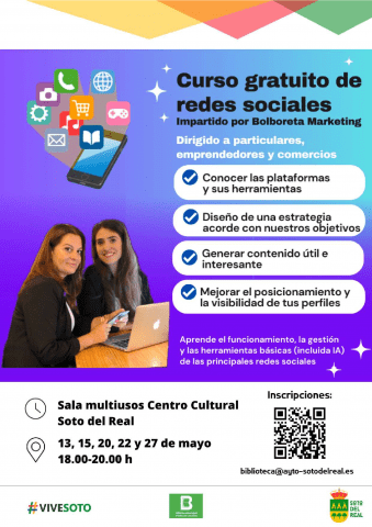 TÍTULO DEL EVENTO: Curso redes sociales: emprendedores, negocios y particulares, a cargo de Bolboreta Marketing TIPO DE ACTIVIDAD: Curso práctico sobre redes sociales FECHAS: 13,15, 20, 22 y 27 de mayo HORA: 18:00-20:00h LUGAR: Sala Multiusos Centro Cultural INSCRIPCIONES: Gratuitas rellenando este formulario