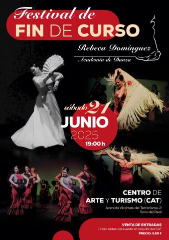 TÍTULO DEL EVENTO: FESTIVAL DE DANZA REBECA DOMINGUEZ TIPO DE ACTIVIDAD: Exhibición de fin de curso de alumnas y profesoras de danza de las distintas modalidades de danza impartidas en la Academia Rebeca Dominguez; FECHA: 21 de Junio; HORA: 19:00 h; LUGAR: CAT Entradas en Academia de Danza Rebeca Domíguez y una hora antes en taquilla.