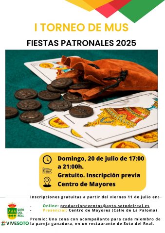 DÍA: Domingo, 20 de julio; HORARIO: 17:00 a 21:00 h; LUGAR: Centro de Mayores; INSCRIPCIONES: gratuitas a partir del viernes 11 de julio en el mail produccioneventos@ayto-sotodelreal.es o en la cafetería del Centro de Mayores y antes del torneo, desde las 16.00 hasta las 16.45 h. Máximo 12 parejas. Premio: Una cena con […]