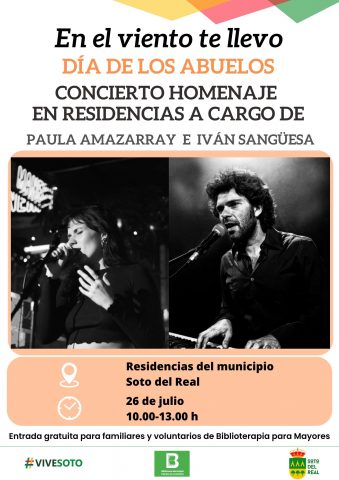 TÍTULO DEL EVENTO: “En el viento te llevo”, Paula Amazarray e Iván Sangüesa TIPO DE ACTIVIDAD: Concierto homenaje a los mayores en residencias FECHA: 26 de julio HORA: 10:00-13:00 h LUGAR: Residencias del municipio