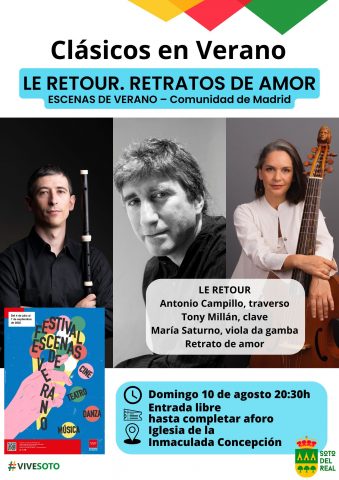 Domingo 10 de Agosto - 20:30 horas - Iglesia de la Inmaculada Concepción CLÁSICOS DE VERANO - Comunidad de Madrid LE RETOUR Antonio Campillo, traverso Tony Millán, clave María Saturno, viola da gamba Retrato de amor