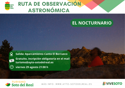 DÍA: 29 agosto; HORA: 21:00 h LUGAR: aparcamiento Canto del Berrueco; ENTRADA: gratuita con inscripción obligatoria, hasta completar aforo. INSCRIPCIÓN: en el mail turismo@ayto-sotodelreal.es