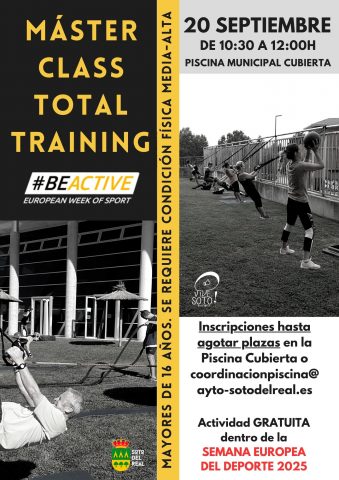 MÁSTER CLASS TOTAL TRAINING (dentro de la SED 2025) FECHA: S-20 Sept. HORA: 10:30 - 12:00 h; LUGAR: COMPLEJO DEPORTIVO PRADO REAL – Zona de jardín; INSCRIPCIONES: Inscripciones hasta completar aforo en la Piscina Cubierta o a través del correo coordinacionpiscina@ayto-sotodelreal.es PLAZAS LIMITADAS (20 MÁX.) PÚBLICO: Deportistas mayores de 16 años. Se requiere condición física […]