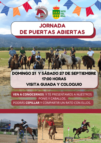 ORGANIZADOR: Club Hípico el Soto FECHA: 21 y 27 de Septiembre HORA: 17:00h LUGAR: HÍPICA EL SOTO PRECIO: GRATUITA + INFO: hipicasotodelreal@gmail.com