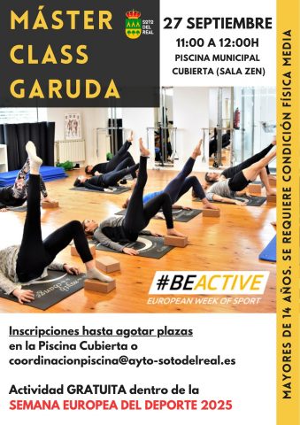 MÁSTER CLASS GARUDA (dentro de la SED 2025) FECHA: S-27 Sept. HORA: 11:00 -12:00 h; PÚBLICO: Deportistas mayores de 14 años. Se requiere condición física media. LUGAR: COMPLEJO DEPORTIVO PRADO REAL – SALA ZEN; INSCRIPCIONES: Inscripciones hasta completar aforo en la Piscina Cubierta o a través del correo infopiscina@ayto-sotodelreal.es PLAZAS LIMITADAS Intensidad MEDIA Máster Class […]