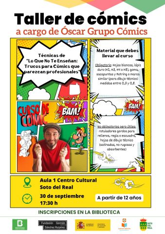 Taller de cómics: "Lo Que No Te Enseñan: Trucos para Cómics que parezcan profesionales" A cargo de Óscar Grupo Cómics. Fundación Germán Sánchez Ruipérez FECHA: Martes 30 de septiembre HORA: 17:30 h LUGAR: Aula 1 Centro Cultural; PÚBLICO: a partir de 12 años;