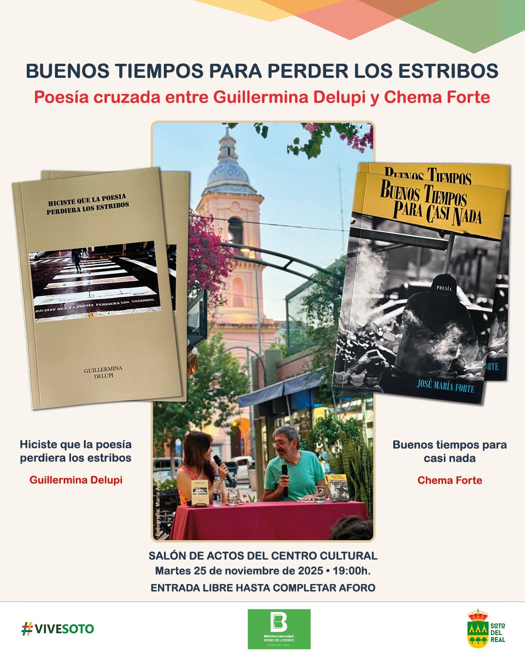 Buenos tiempos para perder los estribos: Poesía cruzada entre Guillermina Delupi y Chema Forte Recital poético con Guillermina Delupi y Chema Forte FECHA: Miércoles 25 de noviembre HORA: 19.00 h LUGAR: Salón de actos Centro Cultural Pedro de Lorenzo. |
