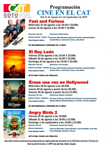 GRAN FESTIVAL DE CINE DE VERANO: ANGRY BIRDS 2 30, 31 de agosto y 1 de septiembre 30 de agosto: 19:00h 31 de agosto: 19h y 21h 1 de septiembre: 19h y 21h Centro de Arte y Turismo Precio: 5,50€ en taquilla una hora antes de cada proyección