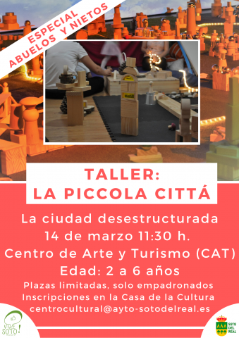 TALLER: LA CIUDAD DESESTRUCTURADA ESPECIAL ABUELOS, ABUELAS, NIETOS Y NIETAS 14 de marzo, 11:30h. Centro de Arte y Turismo Plazas limitadas, solo para empadronados. 16 personas (8niños+8adultos) Inscripciones en el Centro Cultural Edades a las que va dirigido: niños y niñas de 2 a 6 años. Francesco Tonucci, pedagogo italiano, reivindica ciudades más amables con la […]