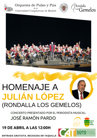 HOMENAJE A JULIAN (LOS GEMELOS) Espectáculo de Música Homenaje a Julián López (Los Gemelos), presentado por José Ramón Pardo (periodista musical) con actuación de: Orquesta de Pulso y Púa de la Universidad Complutense de Madrid Domingo 19 Abril 12:00 h. CAT – Centro de Arte y Turismo DURACIÓN del espectáculo 80 minutos INSCRIPCIONES Pases en […]
