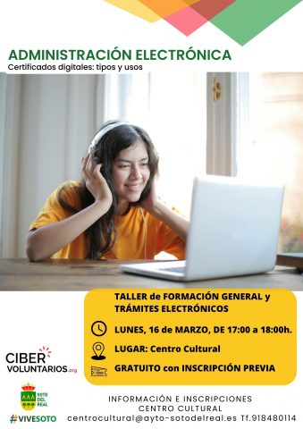 FECHA: 16 marzo; HORARIO: 17:00 a 18:00 h LUGAR: Centro cultural. GRATUITO con INSCRIPCIÓN PREVIA en Centro Cultural (presencial, mail, teléfono). Descubre la importancia de la firma electrónica, que son los certificados digitales, tipos y formatos de certificados, como puedo obtenerlos e instalarlos. Identifica los organismos para acreditar la identidad y la certificación digital.