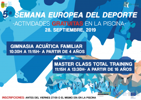 ACTIVIDADES GRATUITAS EN LA PISCINA 28 de septiembre GIMNASIA ACUÁTICA FAMILIAR De 10:30 a 11:15h. en la Piscina cubierta del Complejo Deportivo Prado Real . A partir de 4 años MASTER CLASS TOTAL TRAINING De 11:15 a 13.30h. en el Gimnasio del Complejo Deportivo Prado Real. A partir de 16 años