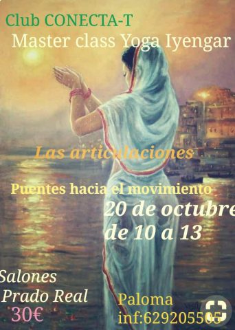 Seminario de yoga Iyengar Domingo 20 de octubre, de 10:00 a 13:00h en los Salones de Prado Real (junto a la piscina cubierta) LAS ARTICULACIONES Sumérgete en la práctica ampliando tus conocimientos del cuerpo que habitamos RESERVA: 629205505