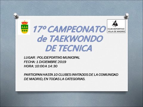 Club de Taekwondo Villa de Madrid 17º CAMPEONATO DE TÉCNICA Campeonato de Técnica que organiza el Club deportivo Villa de Madrid, donde vienen 10 clubes invitados de la comunidad a participar en las categorías: Infantil, Cadete, Junior, Senior, Veteranos y Parejas. El 1 de diciembre de 2019 De 10:00 h. a 14:30 h. Polideportivo Municipal […]