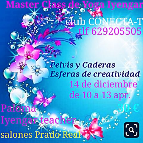 MASTER CLASS DE YOGA IYENGAR SÁBADO 14 DE DICIEMBRE 10:00 a 13:00 h Club Conecta T Salones Prado Real Una Master class donde se trabajará de forma específica pelvis y caderas, con la profesora Paloma Lopez certificada en yoga iyengar. INSCRIPCIÓN: Por correo hasta el 24 de diciembre en aulademujer@gmail.com MÁS INFO: aulademujer@gmail.com