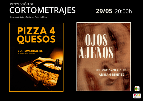 DÍA: 29 de mayo; LUGAR: Centro de Arte y Turismo (CAT), entrada gratuita hasta completar aforo. HORA: 20:00 h; Estreno de los cortometrajes "Pizza 4 Quesos", de Álvaro de la Fuente, y "Ojos Ajenos", de Adrián Benítez, jóvenes de Soto del Real.