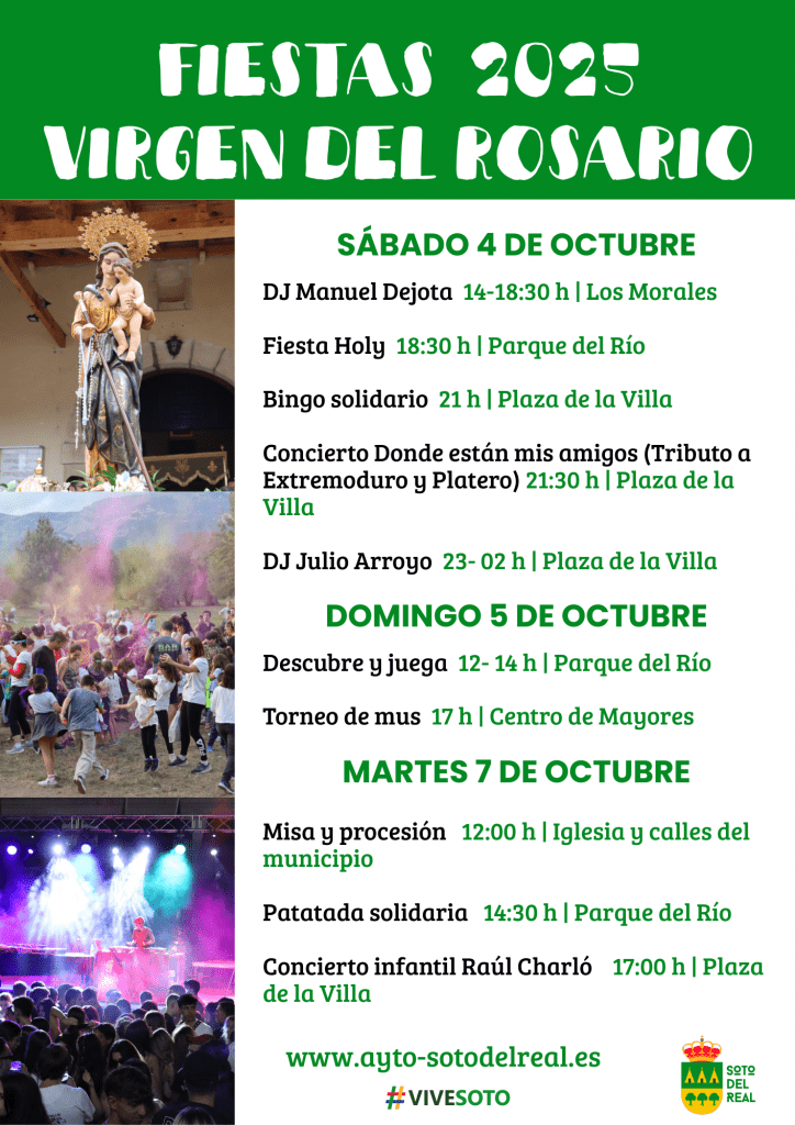 Misa y procesión Acompañada de dulzaineros 12:00 h | Iglesia y calles del municipio Patatas con carne solidarias A beneficio de Caritas Soto 14:30 h | Parque del Río Espectáculo Infantil 17:00 h | Parque del Río