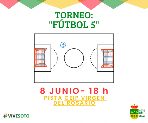 DÍA: 8 junio; HORA: 18:00 h; LUGAR: CEIP Virgen del Rosario; PÚBLICO: Jóvenes de 11 a 17 años; INSCRIPCIONES: gratuitas en juventud@ayto-sotodelreal.es Torneo de Fútbol 5 en la pista del Colegio Virgen El Rosario. Se jugará a un Rey de la pista hasta que tengamos vencedor.