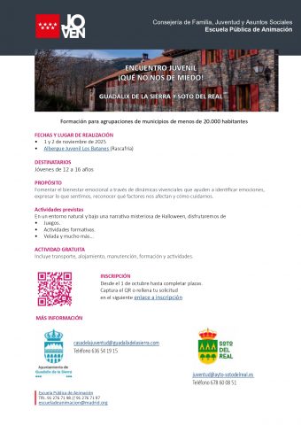 DÍA: 1 y 2 de noviembre; HORA: todo el día; LUGAR: Albergue Juvenil Los Batanes (Rascafría); PÚBLICO: 12 a 16 años (nacidos 2013 a 2009); INSCRIPCIÓN: Inscripción del 1 de octubre hasta completar plazas. Formulario en: https://forms.gle/YuMLF6MByywBQHLY6 🍂 Encuentro juvenil "¡Que no nos dé miedo!" organizado por Guadalix de la Sierra y Soto del Real. […]