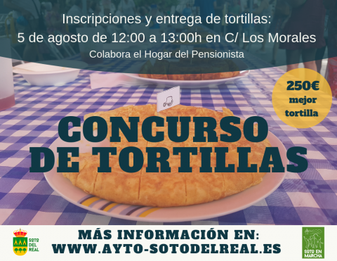 CONCURSO DE TORTILLAS Lunes 5 de agosto Horario: De 12:00h a 13:00h. Recepción de tortillas Calle de los Morales Organizado por el Hogar del Pensionista Bases concurso de tortillas 2019 Inscripción concurso de tortillas 2019