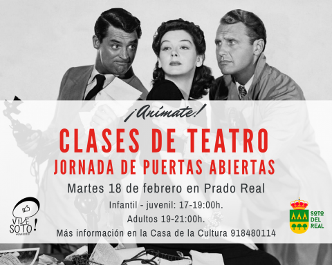 JORNADA PUERTAS ABIERTAS CLASES DE TEATRO INFANTILES-JUVENILES Y ADULTOS Conoce en primera persona las nuevas clases de teatro impartidas todos los martes en los Salones Prado Real de Soto. Jornada de puertas abiertas por edades: 17h a 19h: Infantil y juvenil 19h a 21h: adultos