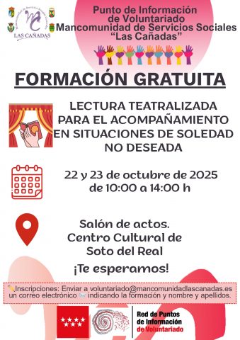 “Lectura Teatralizada para el acompañamiento en situaciones de Soledad No Deseada”. 📅 Cuándo: 22 y 23 de octubre de 2025🕙 Horario: 10:00 a 14:00 h📍 Dónde: Salón de Actos – Centro Cultural de Soto El objetivo es dar a las personas voluntarias y vecin@s interesad@s herramientas prácticas para usar la lectura como medio de acompañamiento y apoyo emocional.