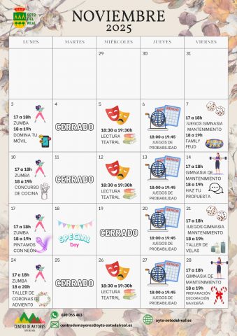 Taller de coronas de adviento con Ana Floristería. Día: lunes, 24 de noviembre Hora: 18:00 h Lugar: Centro de Mayores Inscripciones a través del teléfono 690 055 463 o del correo electrónico centrodemayores@ayto-sotodelreal.es. También de forma presencial en el Centro de Mayores, en horario de lunes a viernes de 16:00 a 20:00 h. (martes cerrado).