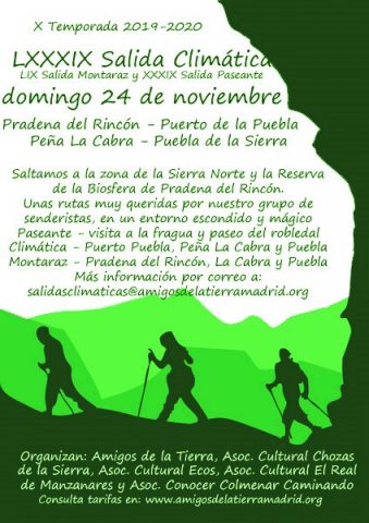 DOMINGO 24 8:30 a 17:00h SALIDA CLIMÁTICA, MONTARAZ Y PASEANTE por la Reserva de la Biosfera Sierra del Rincón. Amigos de la Tierra y AC Chozas de la Sierra. Rutas de distintos niveles que terminan todas en Puebla de la Sierra. Inscripciones: www.amigosdelatierramadrid.org www.chozasdelasierra.org PRECIO: 16€ INFO: www.chozasdelasierra.org
