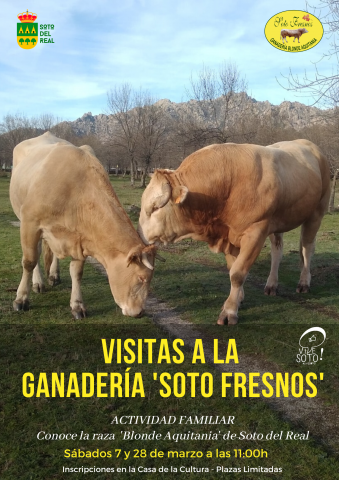 VISITA LA GANADERÍA SOTO FRESNOS Conoce en familia la ganadería explicada por los propios ganaderos 7 y 28 de Marzo a las 11:00h Paseo hasta la ganadería y visita de la misma INSCRIPCIONES: Casa de la Cultura y centrocultural@ayto-sotodelreal.es