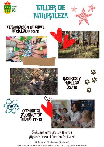 LUGAR ENCUENTRO: Salón de actos del centro cultural DÍA: 3 diciembre; HORA: 11:00 a 13:00 h; PÚBLICO: 6 a 12 años; INSCRIPCIONES: Centro Cultural / centrocultural@ayto-sotodelreal.es / 918 48 01 14 PRECIO: 5€ por taller o 20€/trimestre. La educación ambiental, imprescindible como sabemos, tiene que ir ligada al juego y al descubrimiento de los niños […]