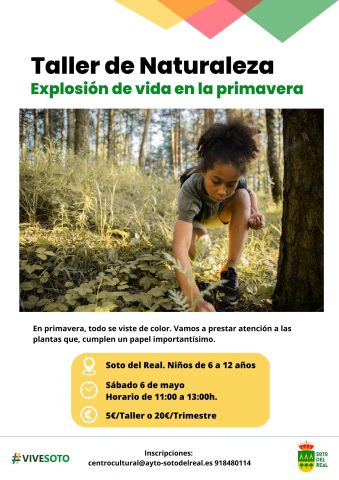 LUGAR: Lugar de encuentro. Salón de Actos Centro Cultural. DÍA: Sábado 6 de mayo. HORA: Horario de 11:00 a 13:00h. INSCRIPCIONES: 5€ por taller o 20€/trimestre. En el Centro Cultural / 918480114 / centrocultural@ayto-sotodelreal.es PÚBLICO: De 6 a 12 años; Cuando llega la primavera, todo en la naturaleza explosiona en mil colores. Se viste de […]