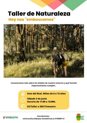 LUGAR: Lugar de encuentro por determinar. DÍA: Sábado 3 de junio. HORA: Horario de 11:00 a 13:00h. INSCRIPCIONES: 5€ por taller o 20€/trimestre. En el Centro Cultural / 918480114 / centrocultural@ayto-sotodelreal.es PÚBLICO: De 6 a 12 años; Los árboles son nuestra protección contra el cambio climático. Tiene la capacidad de capturar el CO2 y convertirlo […]