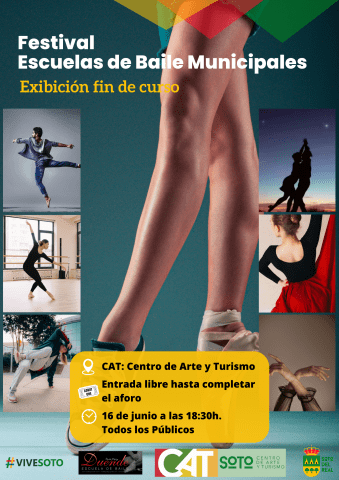 DÍA: 16 de junio; HORA: 18:30 h; LUGAR: C.A.T; PÚBLICO: todos los públicos; ENTRADA: entrada libre hasta completar aforo; Exhibición fin de curso de los alumnos y alumnas de las distintas modalidades de baile impartidas en las actividades municipales.