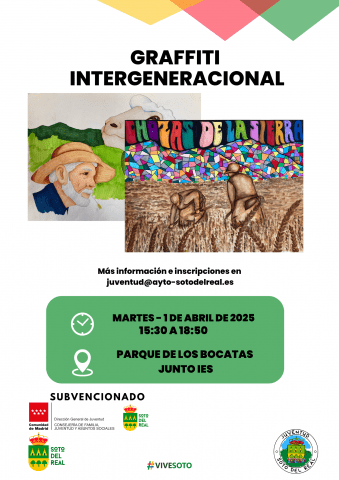 FECHA: MARTES 25 DE MARZO; HORA: 15:30 a 18:30 h; LUGAR: PARQUE DE LOS BOCATAS (JUNTO AL IES); INSCRIPCIONES: A través del siguiente enlace de inscripción: https://forms.gle/wbT1SuU2KgsxMwVk9 (abierto a partir del 3 de febrero de 2025). Plazas limitadas, gratuitas hasta completar aforo. INFO: juventud@ayto-sotodelreal.es Aprende la técnica del graffiti a través del profesional Jorge Ortuño. Con este taller queremos visibilizar la importancia del graffiti como técnica artística así como ayudar a concienciar sobre la responsabilidad de su uso. Taller en colaboración con el…