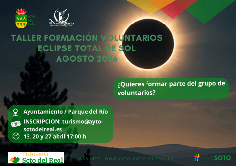 Si quieres formar parte del grupo de voluntarios que este próximo 12 de agosto, conduciremos la actividad de observación del eclipse solar desde nuestro pueblo, apuntate en el mail turismo@ayto-sotodelreal.es y formarás parte del grupo que nos formaremos durante tres sesiones a cargo de El Nocturnario. En estas tres sesiones aprenderemos todo lo necesario para comprender lo que es un eclipse solar, cual es su origen, cómo observarlo con seguridad y como manejar el grupo de personas que juntos veremos…