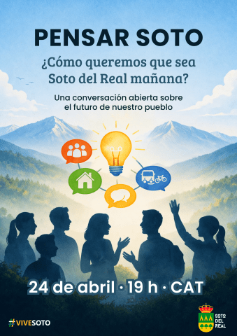 PENSAR SOTO Pensar juntos hoy el pueblo que queremos mañana Viernes 24 de abril | 19:00 h | Centro de Arte y Turismo (CAT) Entrada libre hasta completar aforo El Ayuntamiento de Soto del Real organiza “Pensar Soto”, un encuentro abierto a la ciudadanía para reflexionar de forma conjunta sobre el futuro del municipio. La sesión comenzará con una charla de Enrique Ruz, quien ofrecerá un recorrido por experiencias de transformación en distintas ciudades del mundo. A continuación,…