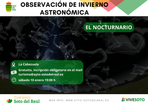 DÍA: 10 de enero; HORA: 19:00 h; LUGAR: Antiguo depósito La Cabezuela; INSCRIPCIÓN: gratuita y obligatoria en el mail turismo@ayto-sotodelreal.es RESERVA DE PLAZAS: aquellos participantes en la ruta astronómica del pasado 29 de agosto de 2025 tendrán preferencia en la inscripción sobre los demás. De nuevo nuestros amigos de El Nocturnario nos ofrecen una experiencia inolvidable de observación astronómica. Esta vez con un cielo de invierno, que nos hará descubrir nuevas costelaciones y posiciones de las estrellas como nunca antes…