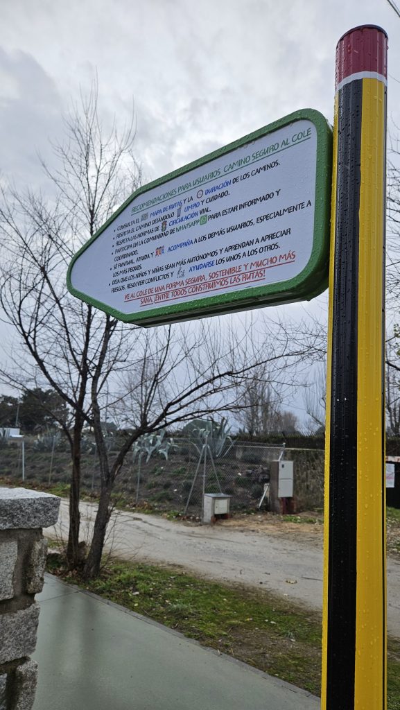 Además de señalizar los puntos de salida con tótems informativos con forma de lápiz en lugares amplios y con buena visibilidad, que sirven de punto de encuentro para que los alumnos y alumnas puedan ir juntos, el recorrido está señalizado con marcas en el suelo cada 50 m.