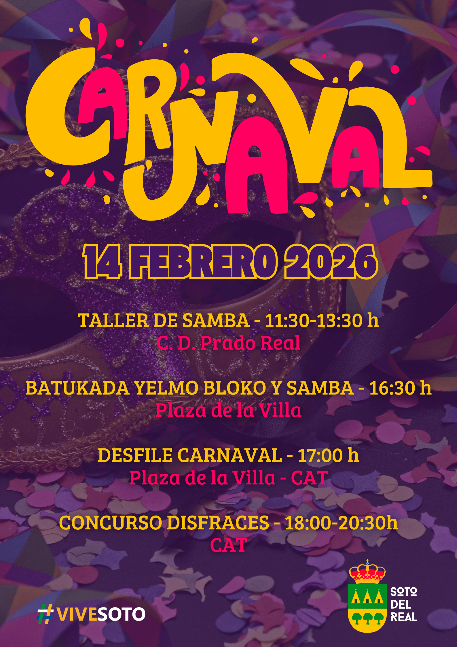 - Soto del Real se prepara para celebrar el Carnaval 2026 el próximo 14 de febrero, con una jornada festiva pensada para disfrutar en familia y con amigos.