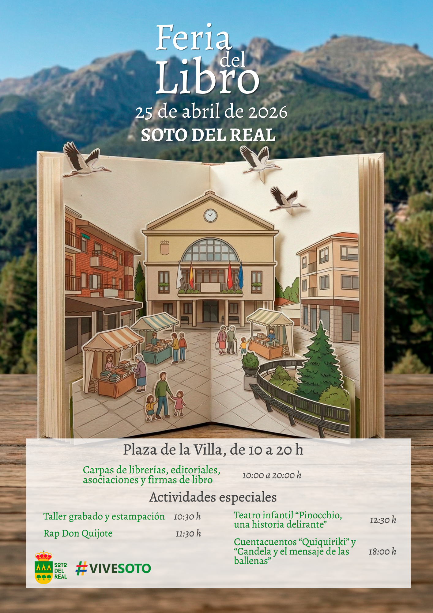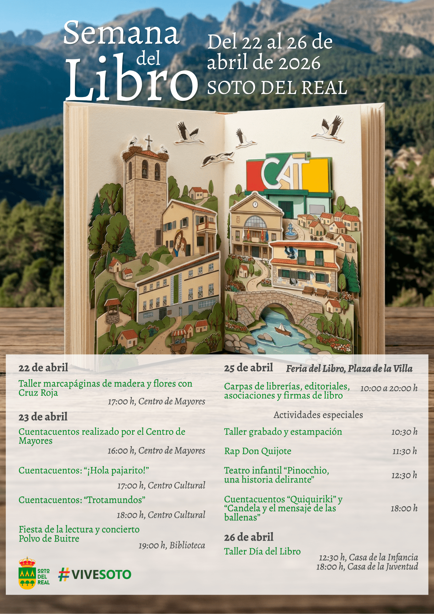 Con motivo del Día Internacional del Libro, que se conmemora el 23 de abril, el Ayuntamiento de Soto del Real ha diseñado una programación cultural diversa y participativa que se desarrollará a lo largo de varios días de esa semana y en distintos espacios municipales.