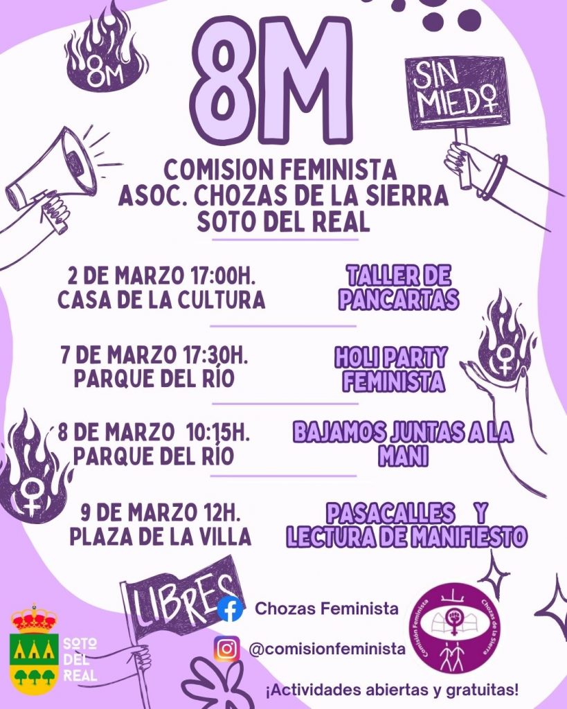 Además de la programación municipal, la Comisión Feminista de la Asociación Cultural Chozas de la Sierra organiza diversas actividades abiertas y gratuitas. El domingo 2 de marzo a las 17:00 h., en la Casa de la Cultura, se llevará a cabo un taller de pancartas. El viernes 7 de marzo, a las 17:30 h., el Parque del Río acogerá la Holi Party Feminista, una celebración llena de color y reivindicación.