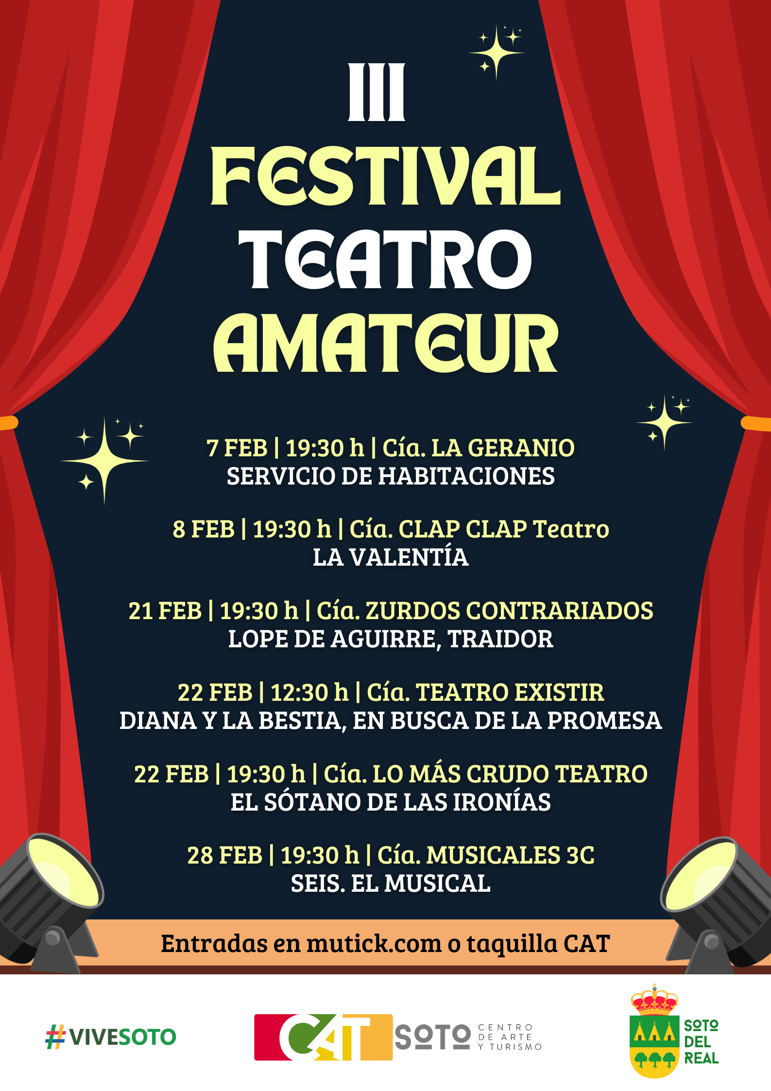 - El Ayuntamiento de Soto del Real recupera y refuerza su Festival de Teatro Amateur con una tercera edición que reúne propuestas de gran calidad artística, diversidad temática y compañías reconocidas en el ámbito del teatro amateur, acercando las artes escénicas a todos los públicos.