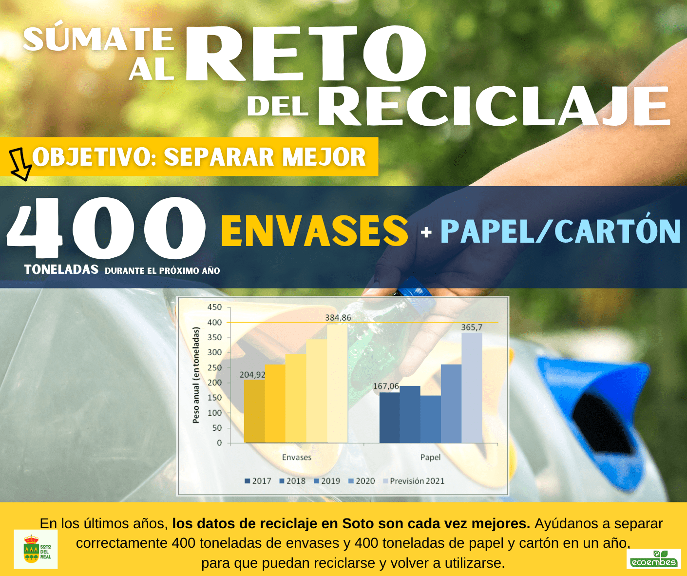El Ayuntamiento de Soto del Real anima a todos los vecinos y vecinas a sumarse a un nuevo reto de reciclaje por el planeta: conseguir, entre todos, separar 400 toneladas de envases y 400 toneladas de papel y cartón en este año (junio 2021 a junio 2022).